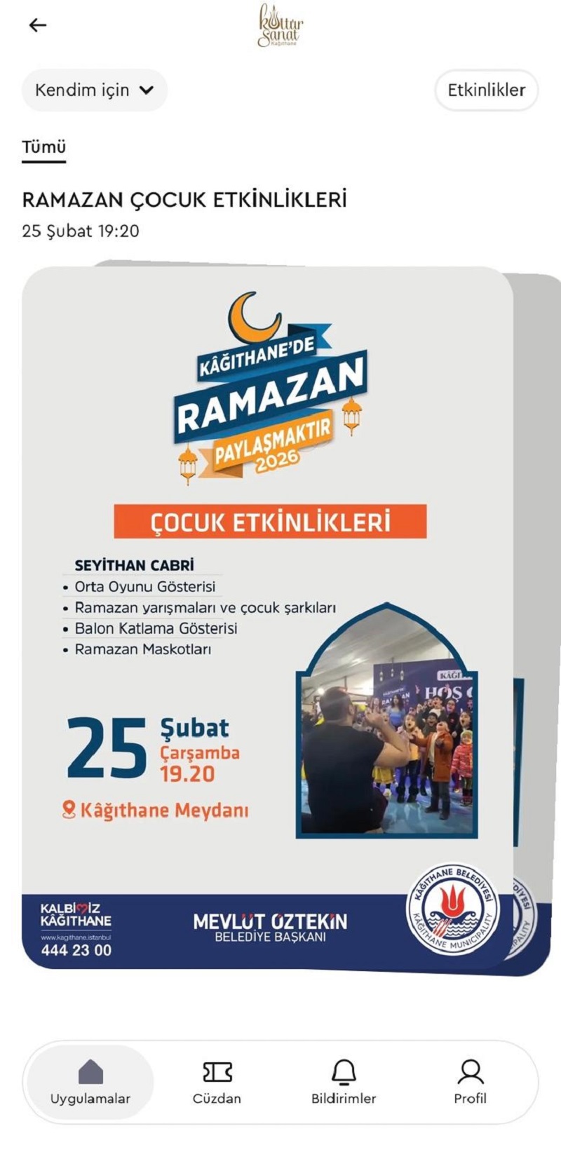 Uygulama üzerinden Kâğıthane Kültür Sanat, Yaşam Beceri Atölyeleri ve Gençvadi programlarına hızlıca kayıt yapılabiliyor; etkinlik ve workshoplara tek tıkla başvuru imkânı sunuluyor.
